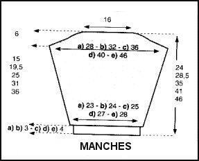 Aiguilles: # 2.5 pour les côtes fantaisie; # 3.5 pour la côte sable et le point fantaisie