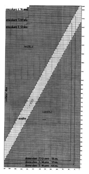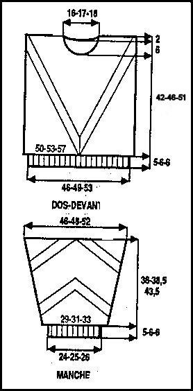 À 47 - 52 - 56 cm de haut. tot., rab. les 12 - 14 - 16 m. centrales. Cont. ch. côté séparément en rab. côté encolure ts les 2 rgs 1 fs 3 m., 3 fs 2 m., 3 fs 1 m.