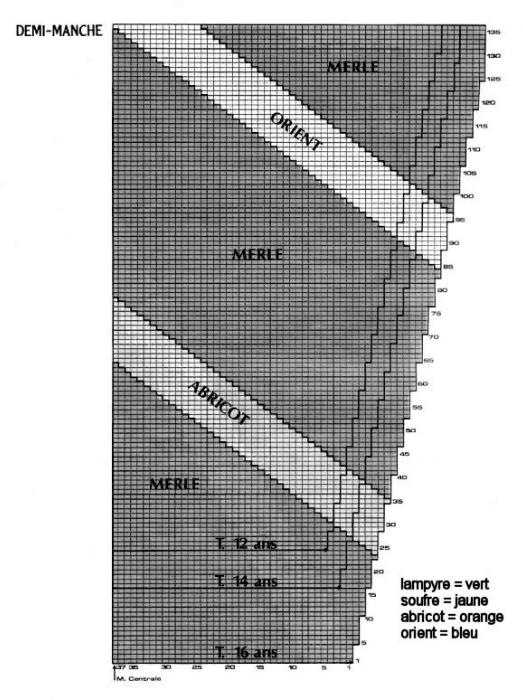Après la 64ème m., tric. en sens inverse, mais en remplaçant le jaune par le vert.Encolure: