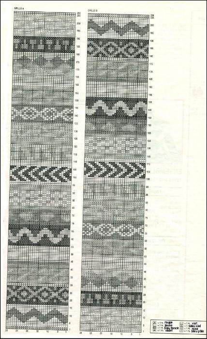 Monter 69 - 73 - 77 m. en bleu. Tric. 6 cm côtes 1/1. Cont. droit jacquard grille "A" en commençant à la m. 1 et