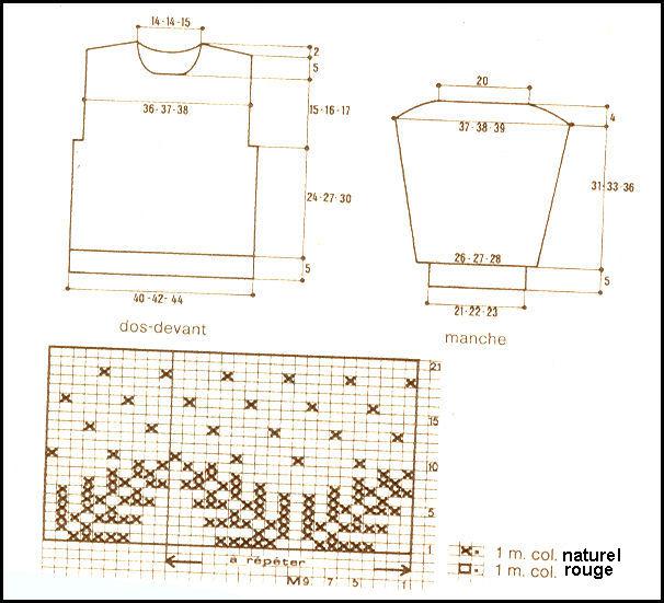 Monter 46 - 48 - 50 m. en rouge. Tric. 5 cm en côtes 2/2. Cont. jacquard en répart. 9 augm. au 1er rg (= 55 - 57 - 59 m.) en centrant la m. M (commencer alors par la m. 3 - 2 - 1 de la grille) en augm. de ch. côté: