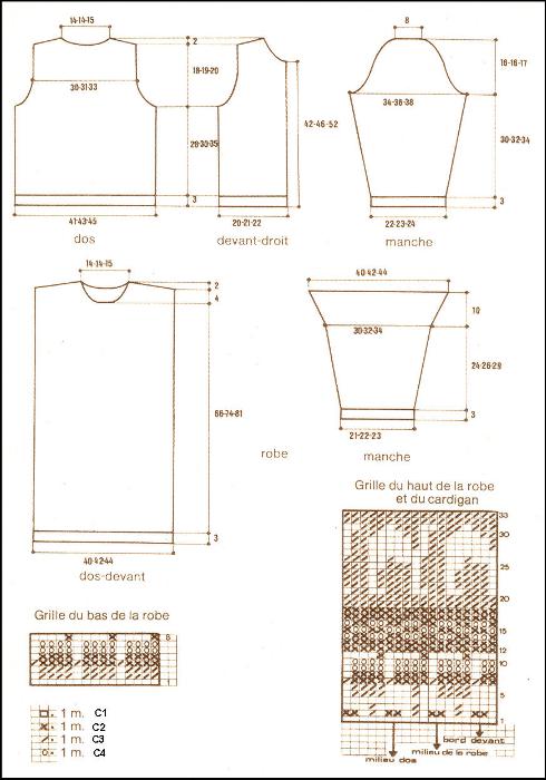Monter 74 - 78 - 82 en C2. Tric. 3 cm côtes 2/2. Cont. en répart. au 1er rg 3 augm. (=77 - 81 - 85 m.), tric. la grille du bas de robe, cont. droit jersey endr. en C2 en répart. 4 dim. au 1er rg (= 73 - 77 - 81 m.). À 43 - 50 - 56 cm de haut. tot., répart. 4 augm. au 1er rg (= 77 - 81 - 85 m.), tric. la grille du bas de la robe, puis des rgs 12 à 33, reprendre 1 fois de 12 à 18, puis reprendre du rg 1 de la grille à 11. Tric. 2 rgs C2 en répart. 4 dim. (= 73 - 77 - 81 m.) tric. 2 rgs C3. Cont. en C2