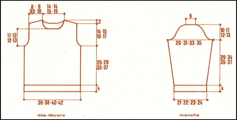 À 11 - 12 - 12 - 13 cm de haut. d'emmanchures, fermer les 15 - 15 - 17 - 17 m. centrales. Cont. ch. côté séparément en rab. côté encolure ts les 2 rgs: