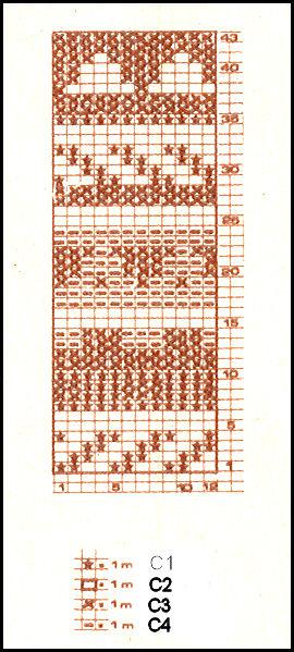 Monter en C2, 59 - 61 - 65 - 67 m. Tric. 4 cm en côtes 1/1. Cont. jacquard en commençant: