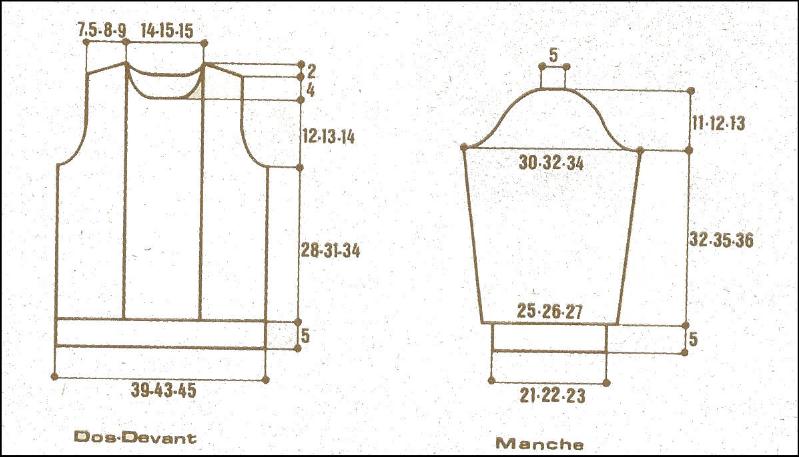 À 12 - 13 - 14 cm de hauteur d'emmanchures, rab. les 8 - 10 - 10 m. centrales. Term. ch. partie séparément en rab. côté encolure ts les 2 rgs: 1 fs 4 m., 1 fs 2 m., 2 fs 1 m.