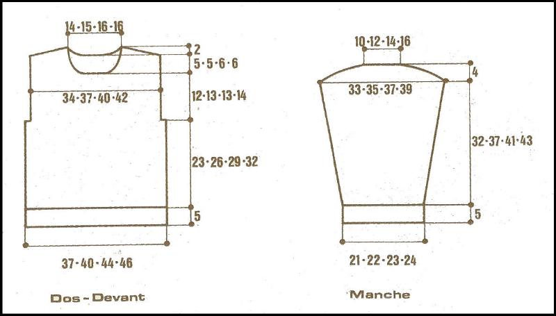 À 12 - 13 - 13 - 14 cm de hauteur d'emmanchures, rab. les 13 - 15 - 17 - 17 m. centrales et term. ch. partie séparément en rab. côté encolure ts les 2 rgs 1 fs 4 m., 4 fs 2 m., 2 s 1 m.