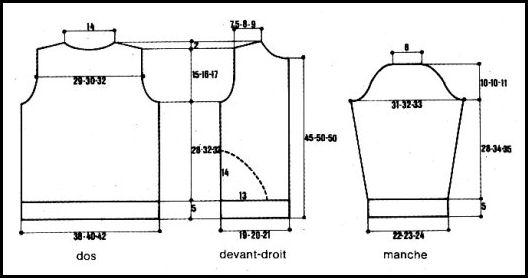 À 33 - 37 - 37 cm de haut. tot., rab. de ch. côté ts les 2 rgs 1 fs 3 - 3 - 4 m., 2 fs 2 m. 3 - 4 - 4 fs 1 m. Cont. droit.