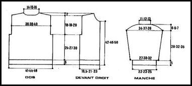 Monter 50 - 54 - 58 m. tric. 5 cm côtes 2/2, cont. point fant. en répart. 12 - 14 - 16 augm. au 1er rg. On obtient 62 - 68 - 74 m. (ne pas faire de m. lis.) et augm. de ch. côté