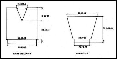 Faire les coutures d'épaules. Poser les manches au point de mailles sur 23.5 - 25 - 27 cm de part et d'autre des coutures d'épaules. Terminer les coutures. Poser le col au point de mailles autour du décolleté, fermer les 2 bords étroits par une couture en biais pour former la pointe.