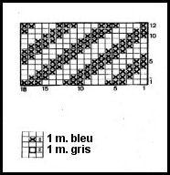 T.12: *21 m. bleu, 3 m. rouge, 66 m. gris, 3 m. rouge, 21 m. bleu*, tric. 9 cm cont. en tric. **21 m. gris, 3 m. rouge, 66 m. bleu, 3 m. rouge, 21 m. gris**, tric. ainsi 4 cm. Tric. 2 rgs rouge, puis 11 cm comme suit = 21 m. bleu, 3 m. rouge, 66 m. jacquard, 3 m. route, 21 m. bleu. Cont. en tric. de ** à ** pendant 9 cm, tric. 2 rgs rouge et terminer en tric. de * à * jusqu'en haut.