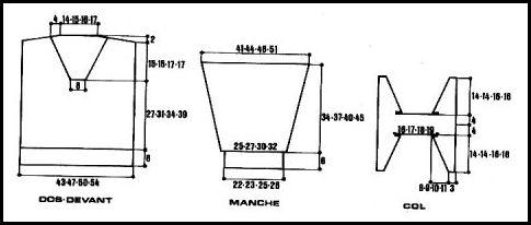Monter 113 - 123 - 131 - 141 m. Tric. 6 cm côtes 1/1 en augm. 1 m. au milieu du dernier rg. Cont. droit point fant. sur les 114 - 124 - 132 - 142 m. obtenues, mais pour T.12 et 16 ans: commencer term. le 5ème rg par 4 m. env. au lieu de 8, le 13ème rg par 3 m. endr. au lieu de 7.