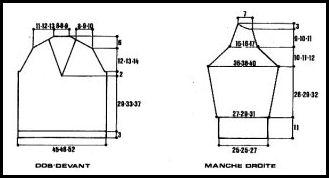 À 32 - 36 - 40 cm de haut. tot., partager le trav. en son milieu, cont. ch. côté séparément en rab. côté encolure dès le 2ème rg: