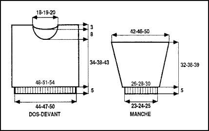 À 39 - 43 - 48 cm de haut. tot. rab. les 10 - 12 - 14 m. centrales. Cont. ch. côté séparément en rab. côté encolure ts les 2 rgs 1 fs 3 m., 2 fs 2 m., 4 fs 1 m.