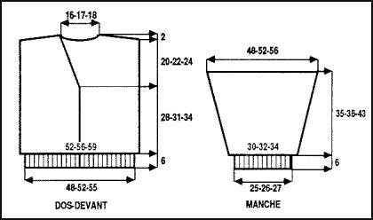 Faire les coutures d'épaules. Poser les manches au point de mailles sur 24 - 26 - 28 cm de part et d'autre des coutures d'épaules. Poser de la même manière les bordures le long des devants et de l'encolure. Term. les coutures. Festonner les boutonnières. Coudre les boutons. Coudre l'écusson au devant gauche.