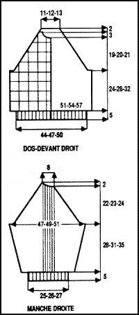 À 19 - 20 - 21 cm de haut. de raglan, rab. à droite ts les 2 rgs 1 fs 5 - 6 - 7 m., 1 fs 3 m., 1 fs 2 m. Après les dim. du raglan, rab. les 3 m. rest. en 1 fois.