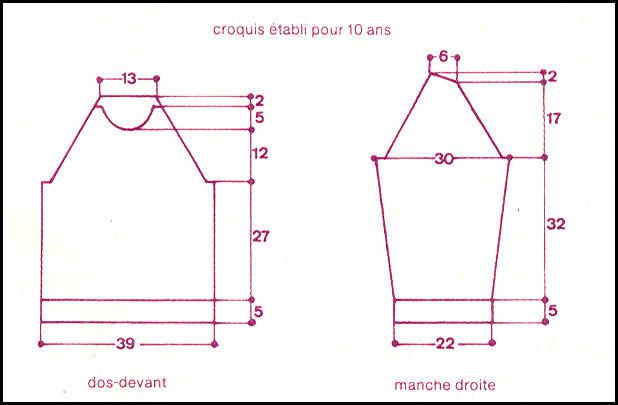 Monter 57 - 59 - 63 m. Tric. 5 cm en côtes 1/1 en augm. 1 m. au milieu du dernier rg (= 58 - 60 - 64 m.). Cont. point fant. Commencer le 2ème rg par 1 m. lis., 2 - 3 - 1 m. endr. au lieu de 4. dès le 3ème rg, augm. de ch. côté 10 - 11 - 12 fs 1 m. ts les 3 cm. À 37 - 39 - 41 cm de haut. tot., former le raglan en rab. côté gauche, comme au dos, côté droit comme au devant. Term. côté droit en rab. encore ts les 2 rgs 2 fs 4 m., 1 fs 5 m.