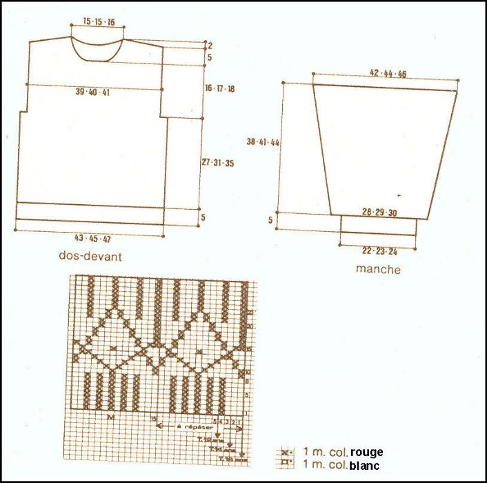 Tric. du 1er au 22ème rg, répéter ensuite le 23ème rg. Après 11 - 12 - 13 cm de haut. d'emmanchures, repr. au 1er rg de la grille et tric. du 1er au 8ème rg jusqu'en haut.
