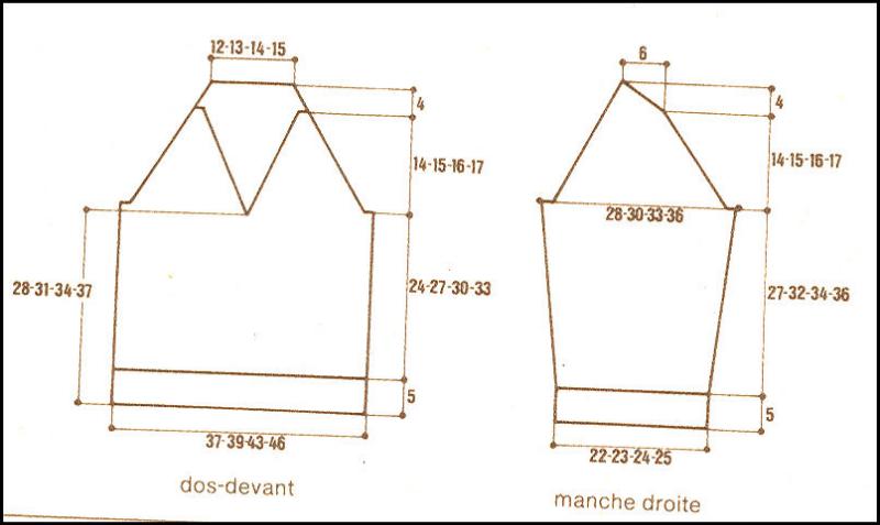 À 28 - 31 - 34 - 37 cm de haut. tot., partager le travail en son milieu, cont. ch. côté séparément en rab. côté encolure 3 fs 1 m. ts les 2 rgs et 14 - 15 - 16 - 17 fs 1 m. alternativement ts les 2 et 4 rgs, après les dim. du raglan, fermer les 4 m. rest. en 1 fois.