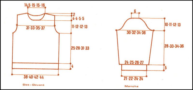 T.14 ans: comme la taille 10 ans, mais tric. le losante sur 29 m. au lieu de 25. Commencer et terminer alors ce losange par 12 m. au lieu de 10. (= 111 m.)Emmanchures