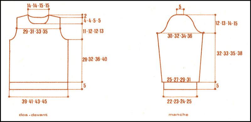 Monter 61 - 65 - 69 - 73 m. Tric. 5 cm en côtes 1/1. Cont. point fant. en répart. 25 - 27 - 29 - 31 augm. au 1er rg (= 86 - 92 - 98 - 104 m.) centrer 6 m. encr. et augm. de ch. côté