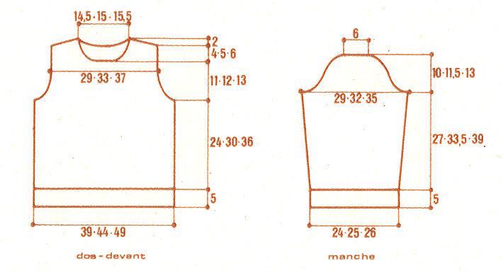 À 11 - 12 - 13 cm de haut. d'emmanchures, rab. les 11 - 13 - 15 m. centrales. Term. ch. partie séparément en rab. côté encolure ts les 2 rgs: 1 fs 5 m., 1 fs 3 m., 2 fs 2 m., 3 fs 1 m.