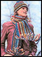 Nouer des franges multicolores sur les bords courts. Pour chaque frange, couper 3 fils d'environ 30 cm de long, les plier en deux, tirer la boucle à travers l'écharpe, passer les extrémités à travers la boucle et resserrer. Égaliser les franges sur environ 13 cm de long.BONNET