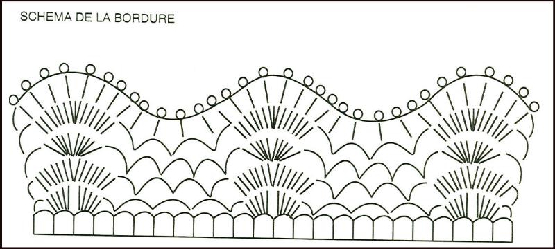 4ème tour: 3 m. en l'air, 1 br. sur ch. des 4 br. suiv., 5 br dans l'arceau de 2 m. en l'air, 1 br. sur ch. des 5 br. suiv., *3 m. en l'air, sauter 1 arceau, 1 m.s. dans l'arceau suiv., 3 m. en l'air, 1 m.s. dans l'arceau suiv., 3 m. en l'air, 1 m.s. dans l'arceau suiv., 3 m. en l'air, **1 br. sur ch. des 5 br. suiv., 5 br. dans l'arceau de 2 m. en l'air, 1 br. sur ch. des 5 br. suiv.*. Répéter de * à *. Term. en croch. de * à **, 1 m.c. sur la 3ème m. en l'air du départ.