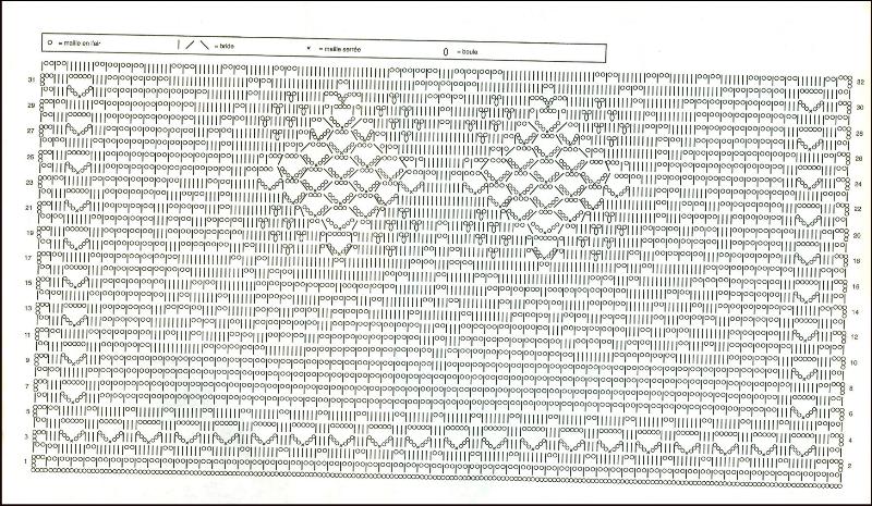 1er rg: 1 br. sur la 9ème m. en l'air, *2 m. en l'air, sauter 2 m., 1 br. sur la m. suiv.*. Répéter de * à *. Cont. en suivant la grille Après le 32ème rg, cont. comme précédemment pour les motifs de ch. côté, cont. en sens inverse pour la partie centrale (33ème rg = 31ème rg / 34ème rg = 30ème rg / etc...)