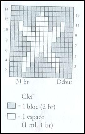 5ème rg: 5 m. end. *C8D (1 jeté, Ss) 3 fois, 1 m. end. (2 m. end. ens., 1 jeté) 3 fois* Rép. de * à * jusqu'aux 13 dern. m., C8D, 5 m. end.