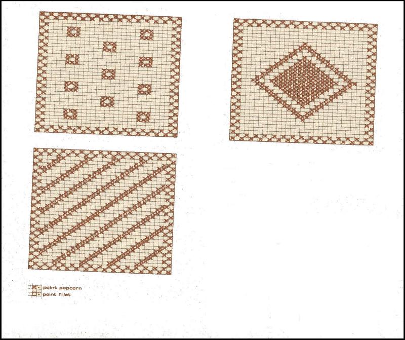 2ème rg et chaque rg suivant: 5 m. en l'air pur tourner, 1 b. sur la 2ème br., *2 m. en l'air, 1 b. sur la b. suiv.* Rép. de * à *, term. par 2 m. en l'air, 1 br. dans la 3ème m. en l'air après la dernière bride.Point popcorn: se croch. en remplacement des 2 m. en l'air entre 2 b. du point filet.