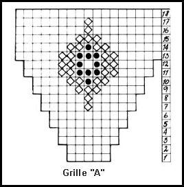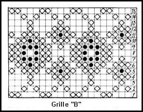 Lorsque vous avez terminer la grille cont. en blanc. Au 2ème tour en blanc commencer les dim.:2ème tour: *8 m. end., 2 m. ens. à l'endr., 8 m. end., 2 m. ens. à l'end.*, rép. toujours de * à *.