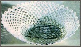 2ème rg: 3 m. chaîn., 1 br. dans la br. suiv., 1 br. dans les m. chaîn. du début du rang précédent. Tourner. Rép. ce 2ème rang encore 9 fois. Arrêter. Coudre l'anse en haut du panier, et le garnir avec un ruban.