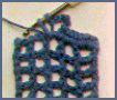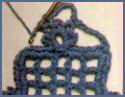 2ème rg et ts les autres rangs: commencer le rang par 2 m. en l'air (la 1ère viendra se placer au-dessus de la 1ère br. qui se présente du rang précédent et la 2ème se placera au-dessus de la m. en l'air qui suit la br.) puis *1 br. dans la br. qui suit, 1 m. en l'air, passer la m. en l'air correspondante,*; terminer par 1 br. dans la dernière br. qui se présente du rang précédent, 1 m. en l'air et faire 1 br. dans la m. en l'air qui suit, 2 m. en l'air et tourner. On obtient ainsi, pour chaque rectangle, 7 jours sur le rang.