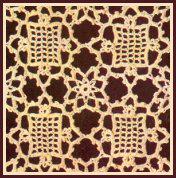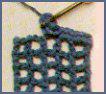 6. L'assemblage des carrés entre eux, par les angles, se fait au cours du 3ème tour. Faire d'abord un 3ème tour complet sur un carré: à la suite de ce carré de départ, viendront les autres. Au 3ème tour du carré suivant, accrocher la 2ème m. en l'air du 2ème picot à faire dans l'arceau obtenu par les 7 m. en l'air du tour précédent, avec le 2ème picot fait dans l'arceau correspondant du 1er carré. Pour cela, dans l'arceau de 7 m. en l'air, faire normalement: 3 m.s., 3 m. en l'air, 3 m.s., 1 m. en l'air, puis piquer le crochet dans le picot du milieu des 3 faits dans l'arceau correspondant du carré précédent, faire 1 jeté sur le crochet et le tirer en boucle au travers du picot et aussi de la boucle qui est sur le crochet, 1 m. en l'air, 3 m.s., 3 m. en l'air, 3 m.s. On a ainsi 2 carrés accrochés ensemble par 1 angle. Continuer de même sur les 3 autres côtés, en raccordant un nouveau carré à chaque angle. Important: faire très attention à bien mettre les jours des grilles rectangulaires dans le même sens.