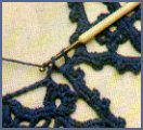 1er rg: faire 1 br. dans la 5ème m. en l'air comptée à partir du crochet, puis *1 m. en l'air, passer la m. en l'air correspondante et faire 1 br. dans la m. en l'air suivante,*; terminer par 2 m. en l'air et tourner;