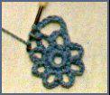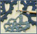 2ème tour: commencer par 5 m. en l'air, puis *passer la 1ère m.s. qui se présente du tour précédent et faire 1 m.s. dans la m.s. qui suit, 5 m. en l'air,*; répéter de * à *, ce qui forme 8 arceaux, en fermant le dernier par 1 m.s. faite dans la m.c. où a été commencé le 1er, ce qui ferme également le tour, arrêter sans casser le coton. Faire alors le tour d'assemblage, en suivant les explications données ci-bas.