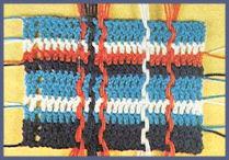 la dernière bride terminée, casser le fil à une distance de la dernière boucle égale à la longueur d'une frange, puis le passer dans cette dernière boucle. Glisser à nouveau le crochet dans la boucle d'où sort le fil cassé; faire un jeté avec le nouveau coloris et le tirer en boucle au travers de la boucle d'arrêt du rang précédent; la boucle tirée doit être à une distance du début du fil égale à la longueur d'une frange; continuer par les 2 mailles en l'air pour tourner. Tirer sur le fil cassé pour serrer la dernière boucle qui enserre le fil mis en travail.Le travail de crochet terminé ne présente que des rayures horizontales plus ou moins hautes, avec des jours placés juste les uns au-dessus des autres.