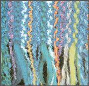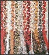 Chaque rectangle est ensuite travaillé au point tissé avec les restes de laine: dans le sens de la largeur passer 2 rangées de point de reprise (ou point de toile, fil à fil) dans chaque rang de grille, comme le montrent les photos ci bas. Pour chaque aller et retour de point tissé, prendre une aiguillée de laine mesurant 2 fois la largeur du rectangle, soit 1 mètre, plus les franges à laisser dépasser soit 2 fois 15 cm - 30 cm. Il faut ici une aiguillée de 1.30 mètre. Si une laine est trop fine par rapport à la plus grosse laine employée, la doubler ou même la tripler pour obtenir pratiquement toujours la même grosseur. Les échantillons photographiés donnent un aperçu des différentes qualités de laines employées ainsi que du mélange de couleurs.À partir des restants de laines, préparer une harmonie de couleurs et placer sur une table les aiguillées dans l'ordre où elles seront utilisées, afin d'être sûr du résultat final. Avec une aiguille à bout rond, glisser les aiguillées en aller et retour les unes après les autres, dans la rangée correspondante, en laissant dépasser 15 cm au début et à la fin, donc toujours du même côté qui sera un des bords du bas du poncho. Préparer également 4 fois 50 aiguillées de couleurs différentes et mesurant chacune 30 cm de long, pour les poser en franges, sur les petits côtés de chaque rectangle: passer chaque aiguillée-frange dans chaque jour du premier et du dernier rg des rectangles et les plier en deux au milieu, laissant ainsi la moitié de l'aiguillée prendre de part et d'autre de la chaînette de montage et du dernier rang du travail. Nouer les franges le long de tous les bords du poncho en prenant les fils semblables et sans jamais les croiser; faire un noeud.