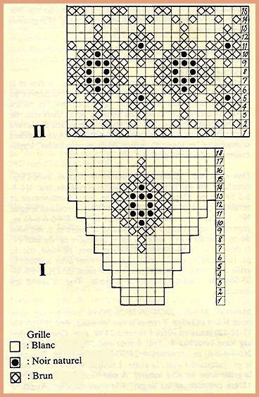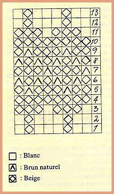 Monter 64 m. avec les aig. # 4 en blanc. Fermer les m. en rond, tric. 12 tours en côtes, 1 m. end., 1 m. env. Cont. avec l'aig. circulaire # 5 au point jersey, tric. 12 tours. Tricoter le point jacquard suivant la grille. Lorsque vous avez terminé la grille continuez en blanc. Au 8ème tour en col. blanc commercer les diminutions: