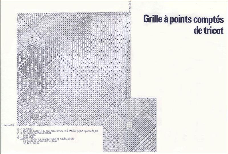 Suivre la grille à points comptés qui représente le 1/4 du napperon. Seuls les rangs impairs sont indiqués sur la grille: aux rangs pairs, tricoter les mailles et les jetés du tour précédent séparément, à l'endroit.