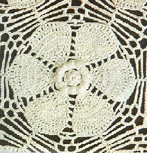 7ème tour: 3 m. en l'air, puis 1 br. dans chacune des 2 premières br. du tour précédent, 3 br. dans la br. suivante; puis 1 br. dans chacune des 3 br. qui suivent, puis 3 br. dans la br. suivante, et 1 br. dans chacune des 3 dernières br. du tour précédent, puis *2 m. en l'air passer les m. en l'air du tour précédent et faire 1 br. dans chacune des 3 premières br. du groupe de 11 du tour précédent, puis 3 br. dans la br. suivante, puis 1 br. dans chacune des 3 br. qui suivent et 3 br. dans la br. qui suit, enfin 1 br. dans chacune des 3 dernières br. du groupe de 11 du tour précédent,*; terminer par: 2 m. en l'air, 1 m.c. dans la 3ème m. en l'air du début du tour.