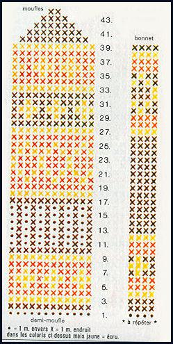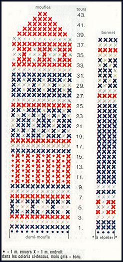 Du 11ème au 16ème tour inclus, tric. en côtes 1/1 unies, puis au 17ème tour reprendre le jersey et suivre la grille pour les dessins. Simultanément, pour le pouce, mettre en attente sur 1 épingle double les 5 m. de la fin de la 2ème aiguille. Avec une aiguillée de laine de couleur différente, monter 5 m. à la fin de cette 2ème aiguille, à la place des 5 m. mises en attente et continuer à travailler en jacquard tout droit et en rond jusqu'à la fin de la main. Au 40ème tour, commencer les dim. du bout de la main: au début de la 1ère et de la 3ème aig., faire 1 surjet simple ts les tour et à la fin de la 2ème et de 4ème aig. tric. 2 m. ens. à l'endroit ts les tours; ceci 4 fois, puis passer la laine dans les 8 dernières mailles, serrer et arrêter avec une aiguille à tapisserie.