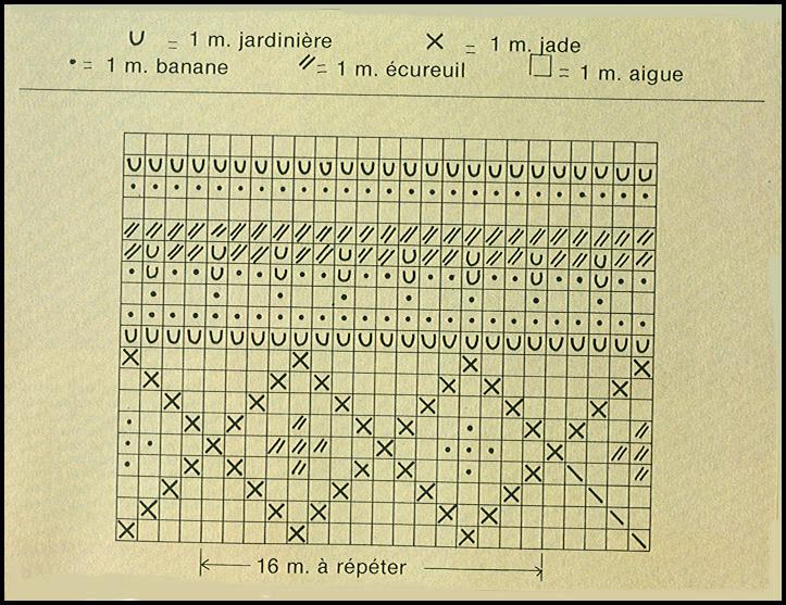 Avec la couleur aigue, monter 69 mailles sur 1 aiguille avec bout. Tric. en côtes 1/1, droit. À 38 cm de haut. tot., mettre les mailles en position pour le jacquard: glisser sur la 3ème aig. toutes les m. qui se présentent à l'envers sur l'endroit du travail et sur l'aig. du trav. toutes les mailles qui se présentent à l'endroit sur l'endroit du travail. Mettre les m. lis. avec les m. qui se présentent à l'env. Sur une aig., celle des m. env., il y a 35 m. et sur l'autre il y en a 34. Trav. sur chaque aig. séparément, au point de jersey. Prendre les m. qui se présentent à l'env. et les tric. à l'env. sur l'endroit du travail et à l'endroit sur l'envers du travail, en faisant au 1er rg 8 augm. régulièrement réparties (= 43 m. obtenues). Tric. ainsi 4 cm de jersey avec la couleur aigue, puis tric. 1 rg avec la couleur banane, 2 rgs couleur jardinière, les rgs jacquard et les rayures de la grille, puis 1 rg avec la couleur aigue, 1 rg couleur banane, 1 rg couleur jardinière. Continuer à tric. 4 cm avec la couleur aigue et laisser en attente. Reprendre les m. laissées en attente sur l'endroit du travail; ajouter 1 m. lis. perlée de chaque côté puis suivre les explications données pour la face envers, mais en faisant au 1er rg, 7 augm. régulièrement réparties (= 43 m. obtenues). Tric. la même hauteur que pour la 1ère face, puis dim. la m. lis. de chaque côté et faire 1 rg en répartissant régulièrement 7 dim. (= 34 m. restantes). Faire également 1 rg sur les m. de la face env. en répartissant 8 dim. régulièrement. Placer alors sur une même aiguille la m. lis. de droite de la face envers, la m. end. de la face end., puis *la m. env. de la face env., la m. end. suivante de la face end.,* et ainsi de suite jusqu'à la fin du rg; terminer par la m. lis. de gauche de la face env. (= 69 m. retrouvées). Reprendre le trav. en côtes 1/1, droit. À 75 cm de haut. tot., le travail est au milieu. Faire la 2ème moitié en suivant les explications données, ainsi que la grille jacquard, à rebours, en vis-à-vis.