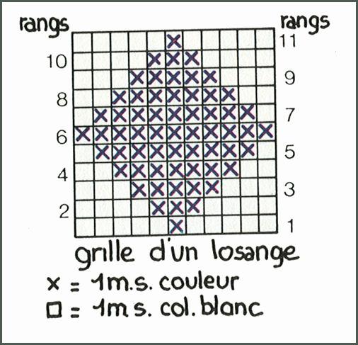 Jacquard au crochet: se travaille en m.s. À chaque changement de couleur, couler déjà les 2 dernières boucles d'avant la 1ère m.s. de couleur différente avec la nouvelle couleur à employer pour la prochaine m.s. Ne pas faire courir le fil dans le travail, jusqu'au prochain changement de couleur; les motifs sont trop espacés: prendre donc une aiguillée pour chaque rang de chaque motif, puis l'arrêter en glissant environ 3 cm du fil dans les m. de même couleur.