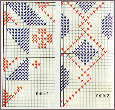 Les 2 grilles donnent la demi largeur du motif avec, à gauche, la m. du milieu. Pour la hauteur, la grille 1 donne la pointe et la moitié du motif à répéter, la rangée du haut représentant le milieu de ce motif.
