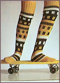 Commencer par le haut. Avec la couleur principale, monter 43 m. et tric. en côtes 1/1. À 10 cm de hauteur, tric. en jersey à rayures et jacquard, en faisant, au 1er rg, 1 augm. au milieu, pour avoir 44 m. Suivre les explications données pour le point employé. Travailler droit. Après la dernière rayure de 2 rgs blanc, continuer avec la couleur principale. Faire 18 rgs en dim. à tous les rgs, 1 m. de chaque côté du travail, à 1 m. des bords soit contre la m. lis.: il reste alors 8 m., passer le fil dans ces 8 dernières mailles, serrer et arrêter. Laisser une aiguillée assez longue pour coudre le dos de la chaussette. Arrêter tous les fils, puis coudre au point de surjet plat, en réunissant les m. lisières correspondantes des bords. Passer un fil élastique double dans le rang de montage des mailles.