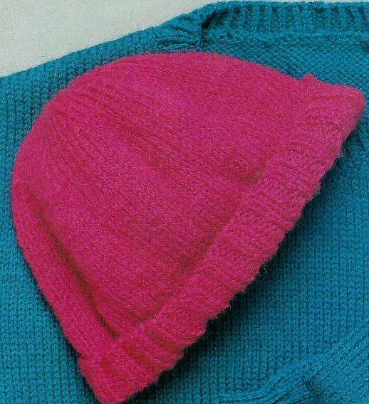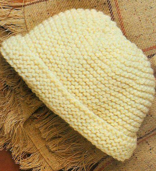 Un carré de 10 cm en point mousse = 12 mailles et 25 rangs.Monter 66 m. avec les aig. # 6 mm, tric. au point mousse pendant 16 cm, puis répartir 11 dim. de la façon suivante: tric. *3 m., 2 m. ens., 1 m.* rép. de * à * encore 10 autres fois pour un total de 11 fois. Il reste 55 m. Tric. 5 rangs, puis répéter ces dim. les unes au-dessus des autres, tous les 2 rangs, jusqu'à ce qu'il ne reste plus que 22 m., tric. ces mailles ensemble 2 par 2 et passer le fil dans les mailles restantes. Serrer pour fermer. Faire la couture de derrière en changeant pour le revers et replier le bord de 3 cm.