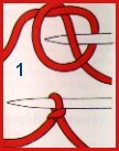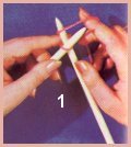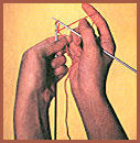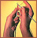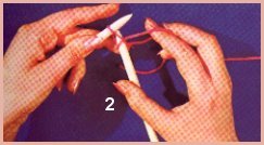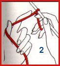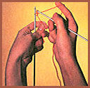 Méthode anglaise: on utilise deux aiguilles à tricoter.Il faut commencer par faire une boucle comme indiqué dans la méthode du pouce, à 8 cm de l'extrémité de la pelote. Avec cette méthode, on travaille avec le fil venant de la pelote; il n'est pas nécessaire de mesurer le fil pour monter les mailles. Glisser la boucle sur une aiguille que l'on tient dans la main gauche.