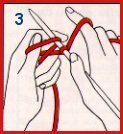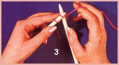 1. Piquer dans cette boucle l'aiguille tenue dans la main droite: tendre le fil venant de la pelote sur l'index de la main droite, puis l'enrouler autour de l'aiguille droite en le passant par-dessous et au-dessus de celle-ci. 2. Ramener le fil à travers la première boucle qui se trouve sur l'aiguille gauche. On forme ainsi sur l'aiguille droite une nouvelle boucle. Glisser cette nouvelle boucle sur l'aiguille gauche. 3. Piquer la pointe de l'aiguille droite entre les deux boucles qui se trouvent maintenant sur l'aiguille gauche puis enrouler à nouveau le fil autour de l'aiguille droite et le ramener à travers les deux mailles de l'aiguille gauche, glisser cette nouvelle maille sur l'aiguille gauche. 4. Répéter le mouvement décrit à la figure 3 entre les deux dernières mailles de l'aiguille gauche jusqu'à l'obtention du nombre de mailles voulu.