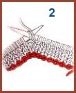 2. Plier le travail en deux; placer l'aig. supplémentaire derrière le travail. Reprendre les m. des deux aig. sur une seule en trav. ainsi: *tric. à l'end. 1 m. de l'aig. supplémentaire et à l'env.; 1 m. de l'aig. du travail*. Rép. de * à *.